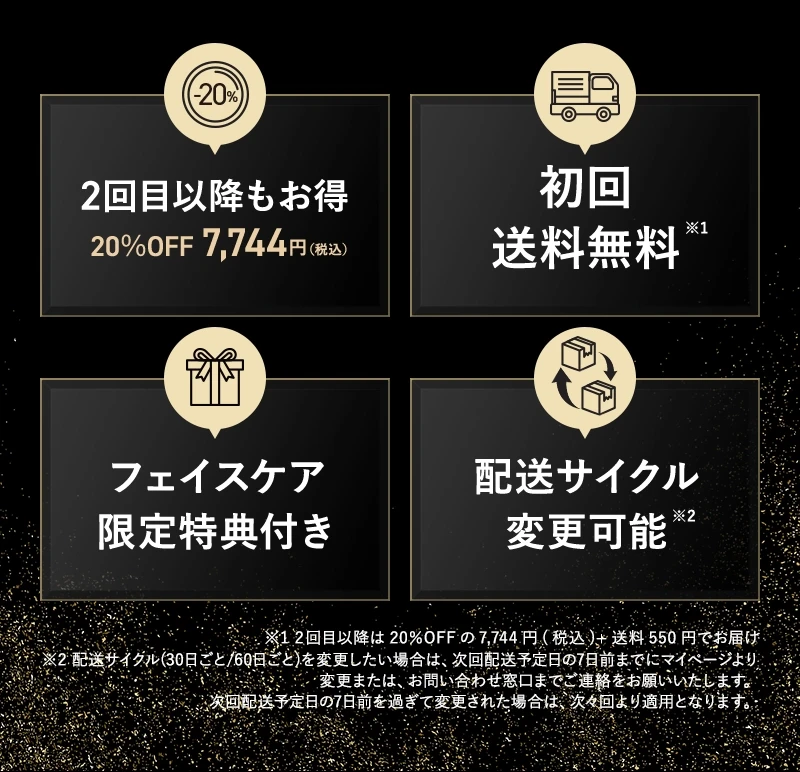 その他の成分:精製水、グリコシルトレハロース・水添デンプン分解物混合溶液、トレハロース、異性化糖、イノシット、植物性スクワラン、濃グリセリン、グリセリルグルコシド液、海藻エキス(1)、エーデルワイスエキス、アシタバエキス、ヒキオコシエキス(1)、N-ラウロイル-L-グルタミン酸ジ(フィトステリル・2-オクチルドデシル)、1,3-ブチレングリコール、1,2-ヘキサンジオール、ポリオキシエチレンポリオキシプロピレンセチルエーテル(20E.O.)(8P.O.)、ポリオキシエチレン硬化ヒマシ油、ポリオキシエチレンポリオキシプロピレンデシルテトラデシルエーテル、トリ(カプリル・カプリン酸)グリセリル、キサンタンガム、クエン酸、クエン酸ナトリウム、フェノキシエタノール、香料